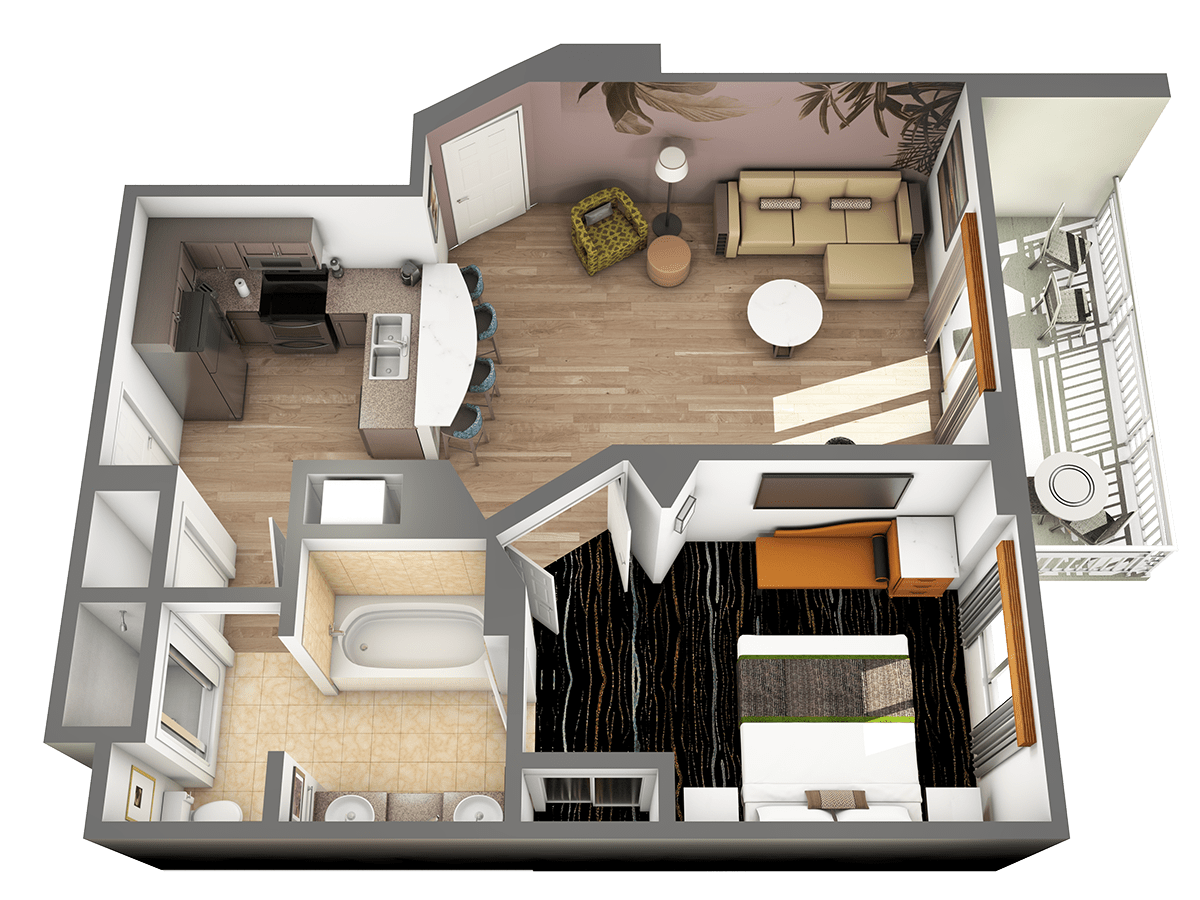 These spacious 971 sq. ft. suites sleep four guests and provide all of the spoils of home. They are thoughtfully appointed with one king bed in the private bedroom and a sleeper sofa in the living room. The spacious bathroom includes dual vanities, a steam shower and a large jetted tub.