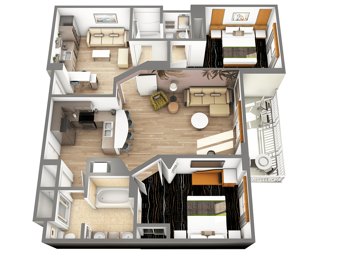 This expansive 1,551 sq. ft. suite seamlessly connects our popular Moorea and Bora Bora suites into one majestic retreat. Accommodating up to eight guests, it offers two private bedrooms, each featuring a king-size bed and two spacious living areas, both with comfortable sleeper sofas. Indulge in two full bathrooms, including a relaxing jetted tub in the master and a steam shower for a spa-like experience.