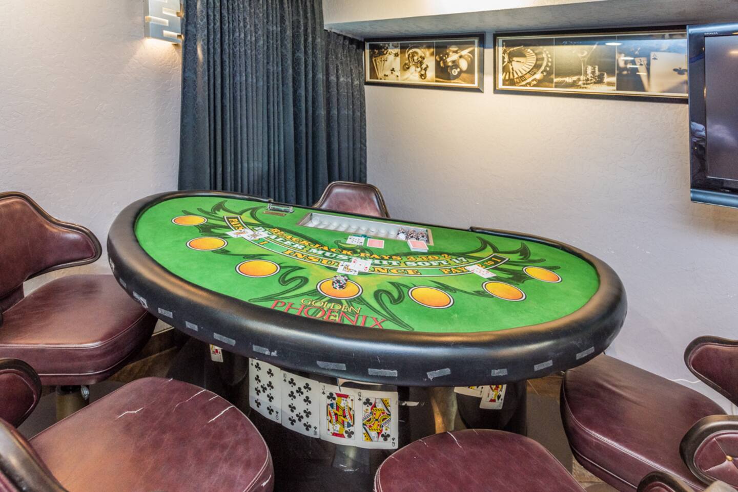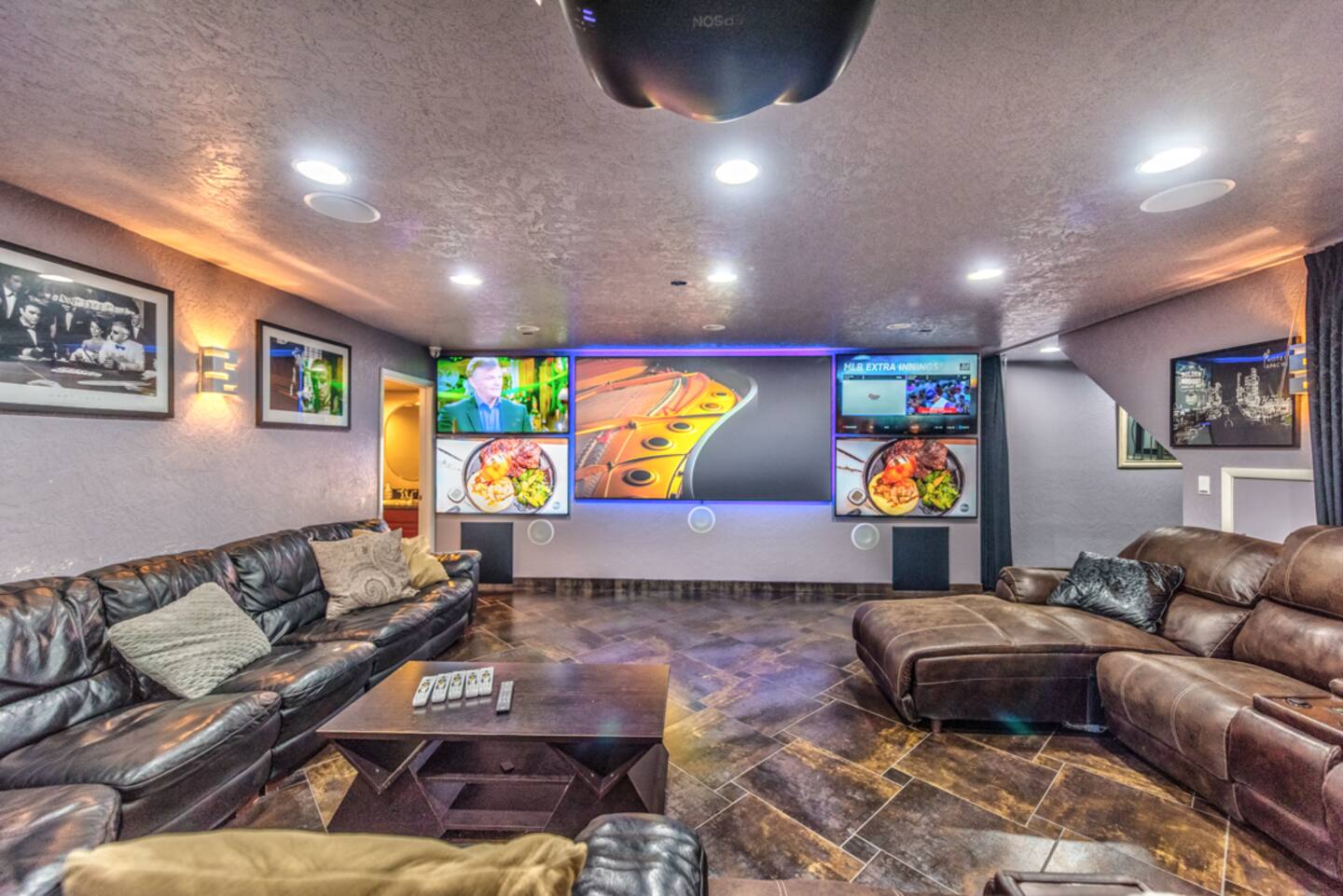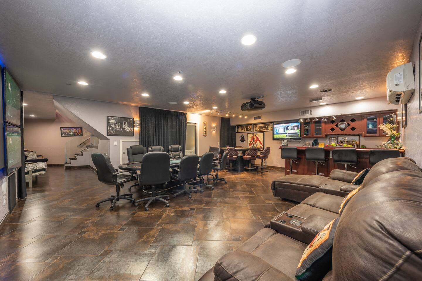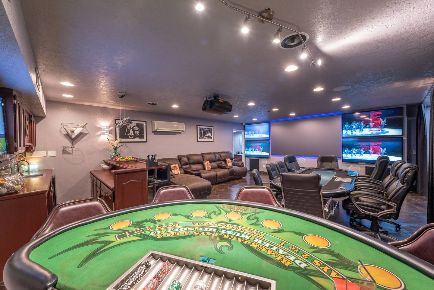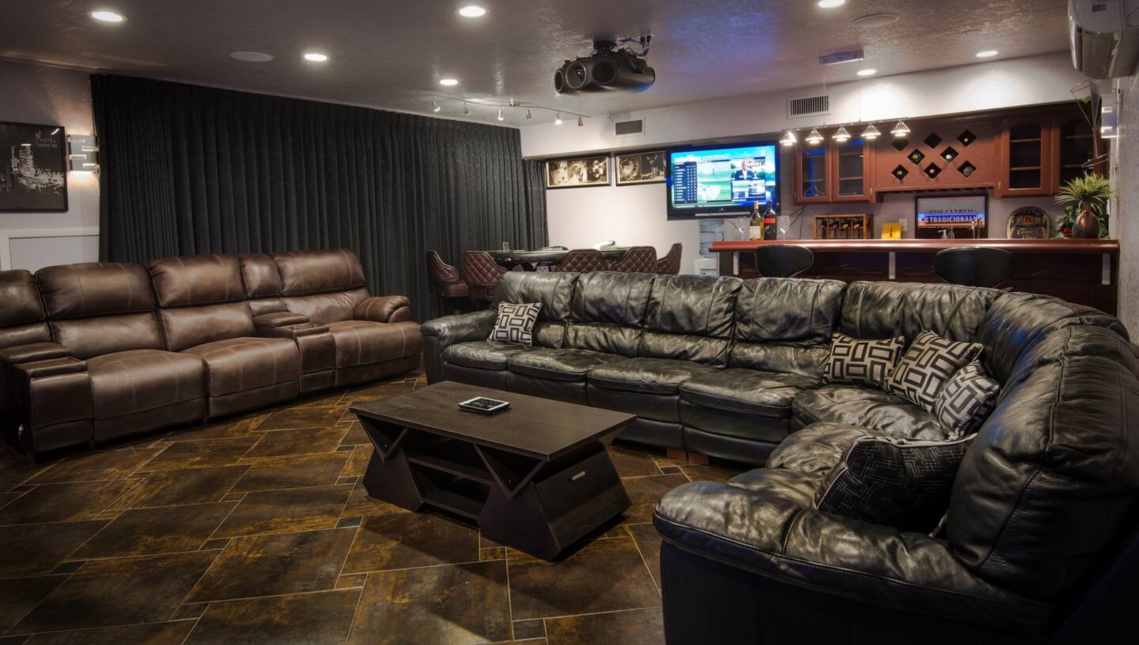 Immerse yourself in cinematic splendor with our state-of-the-art projector theater, where 5 screens await to transport you to another realm. Lounge in comfort as you enjoy your favorite films or host epic movie nights with friends and family, all while indulging in the ultimate entertainment experience. Complete with a professional poker table, casino blackjack table, and bar, our theater promises unforgettable evenings of excitement and luxury.