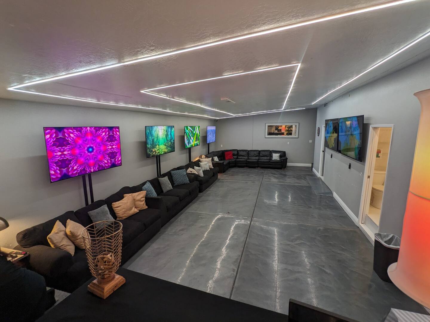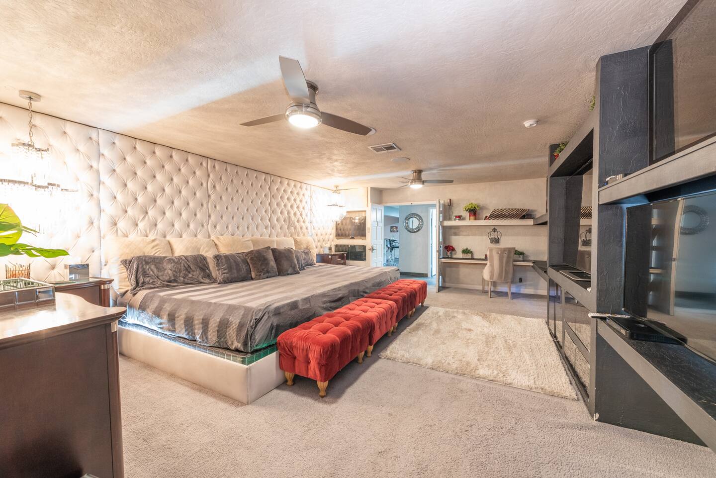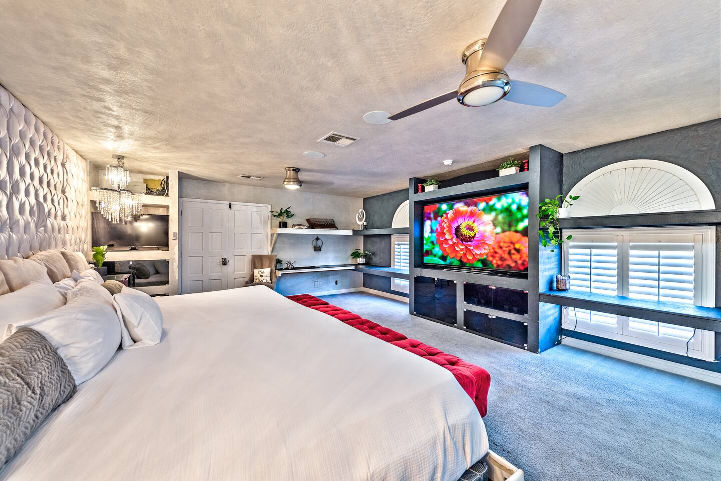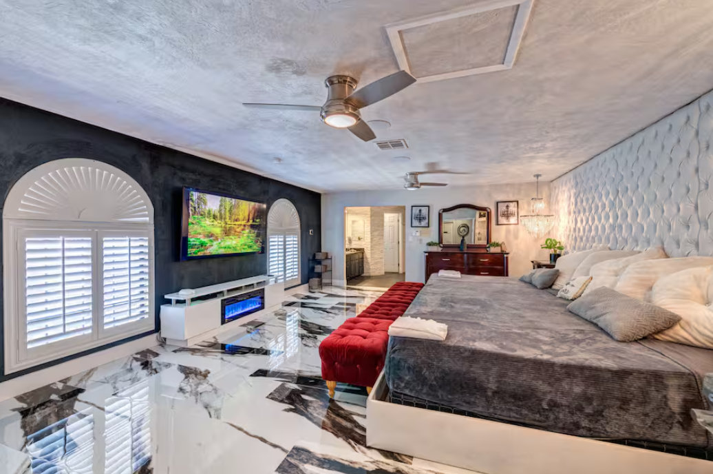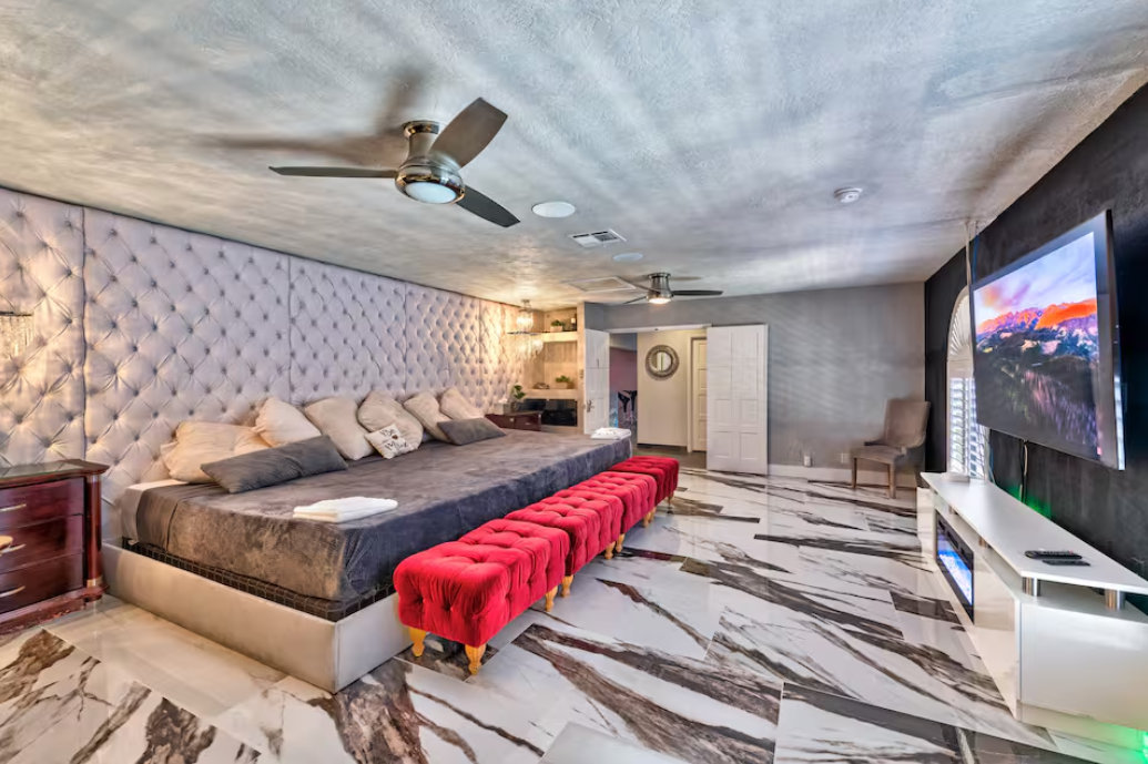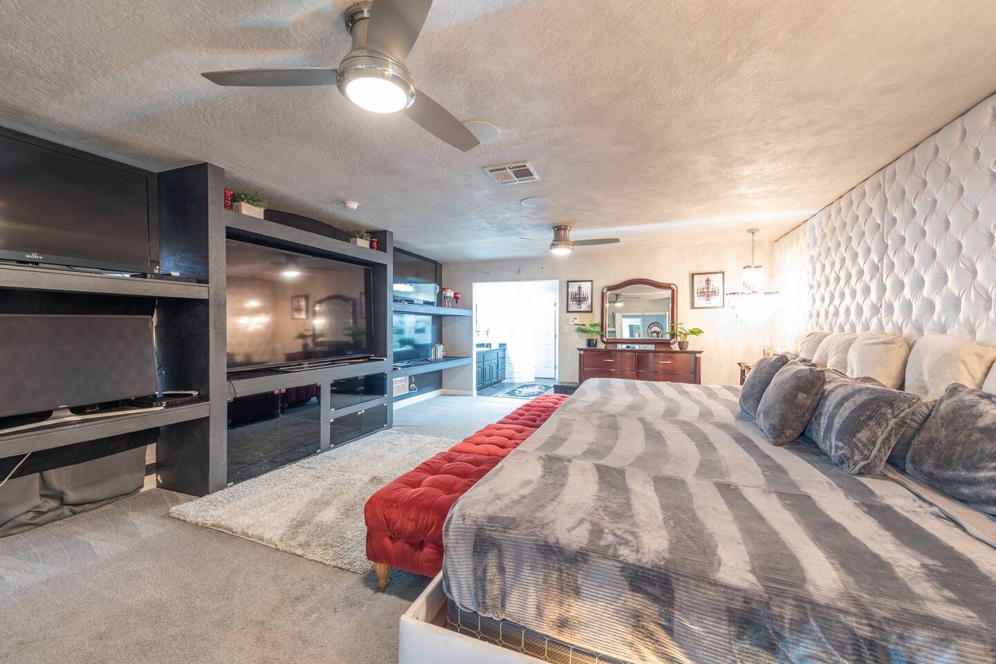Unwind in the master bedroom, where a large screen awaits, surrounded by ample seating, creating a private sanctuary for relaxation and entertainment.