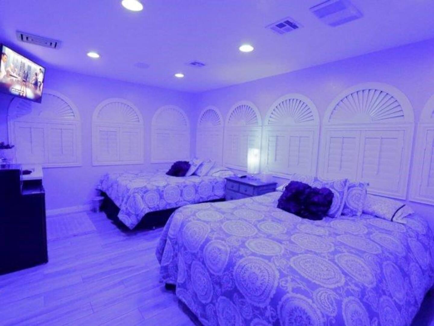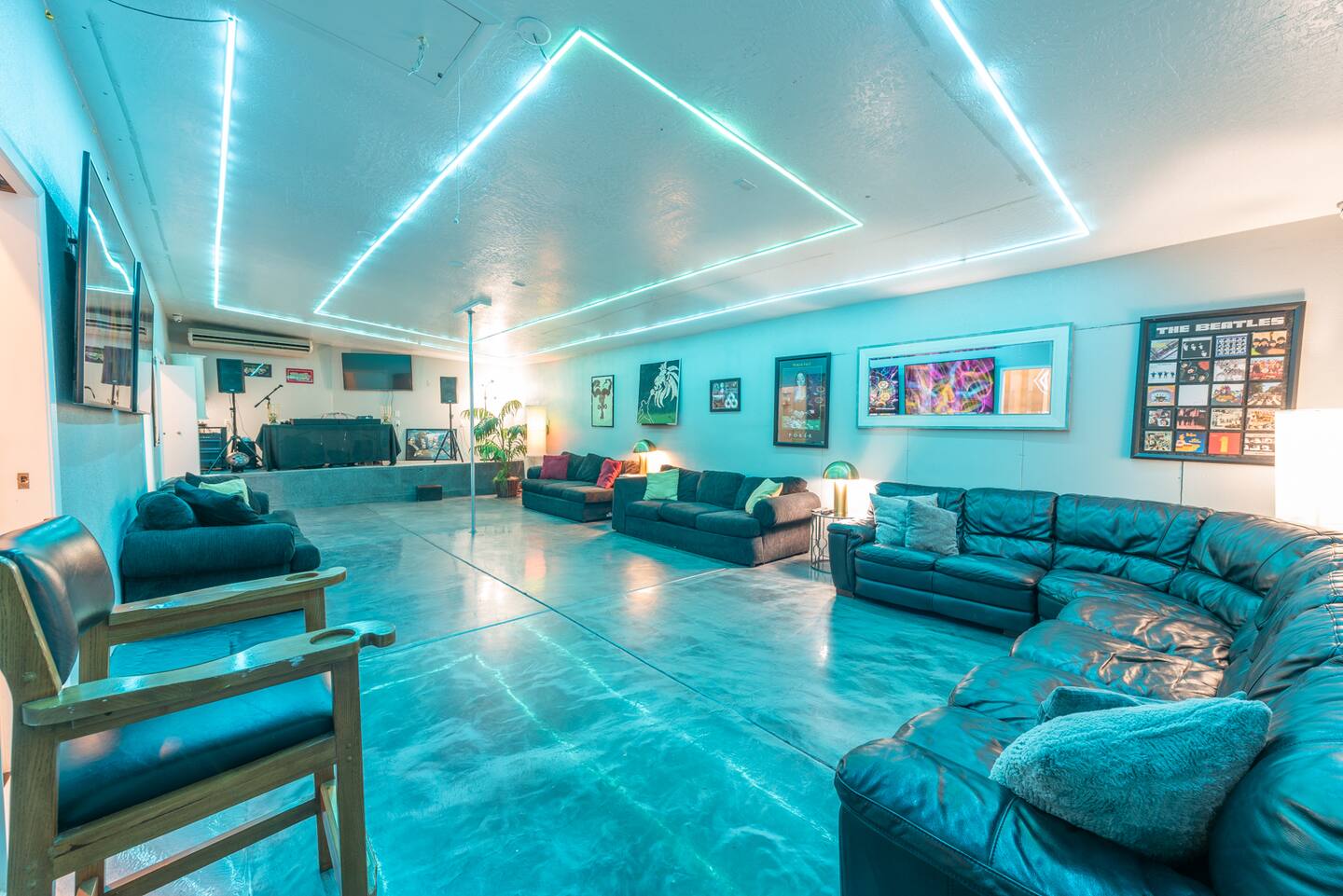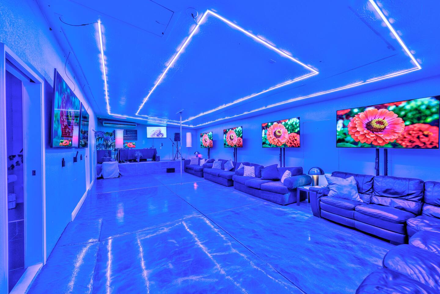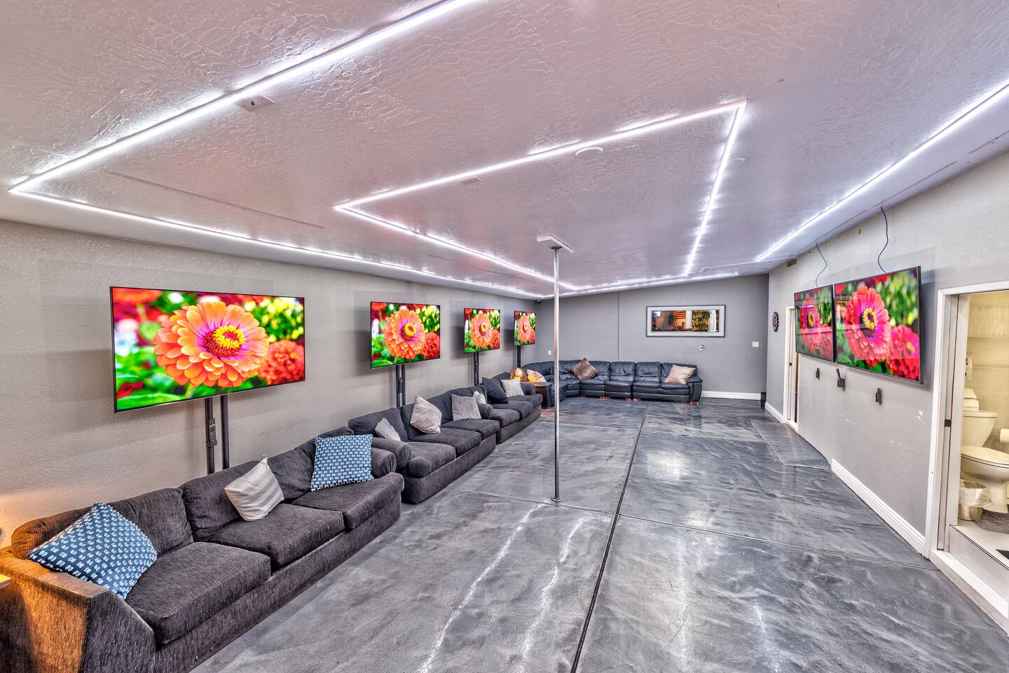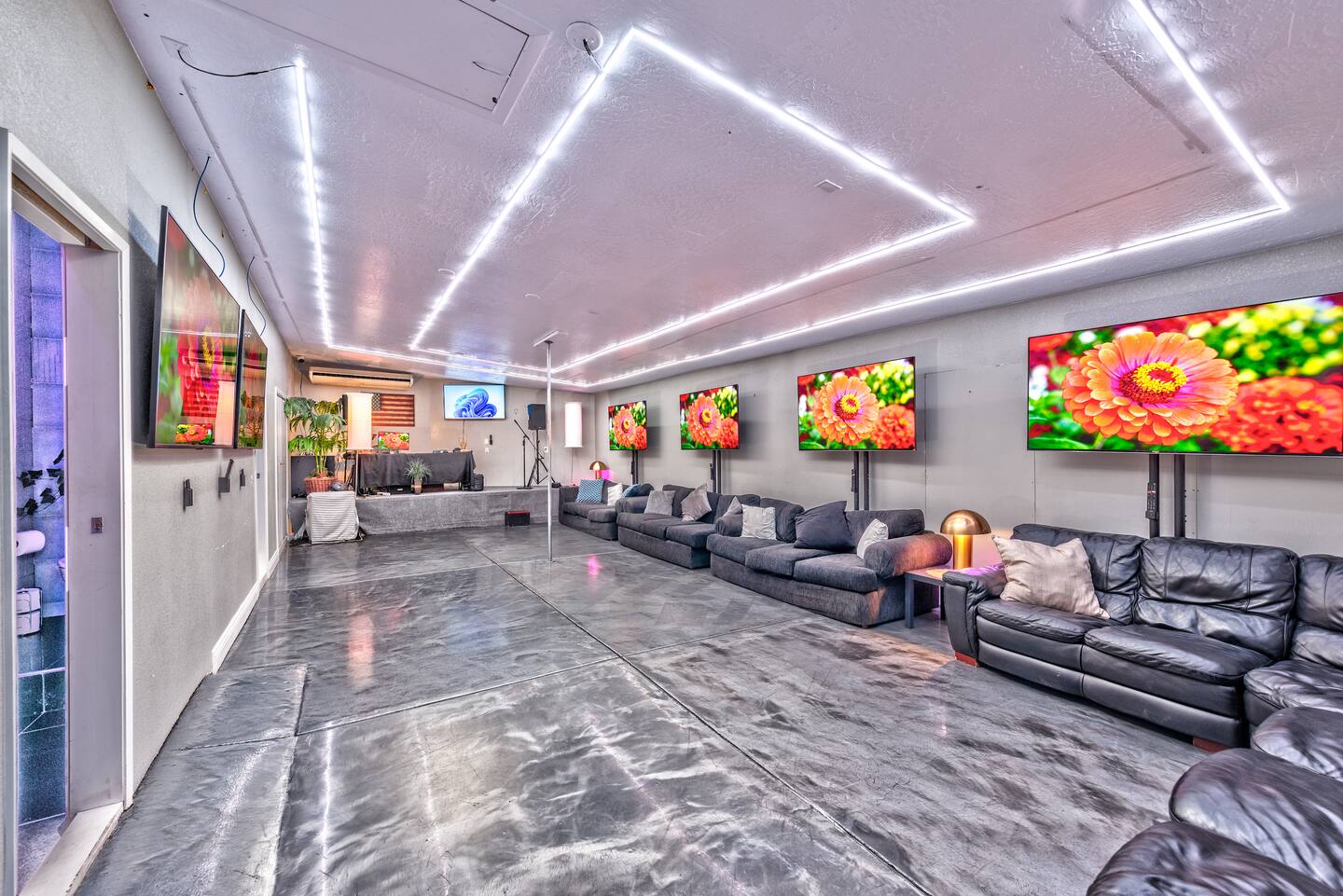 Unwind in the master bedroom, where a large screen awaits, surrounded by ample seating, creating a private sanctuary for relaxation and entertainment.