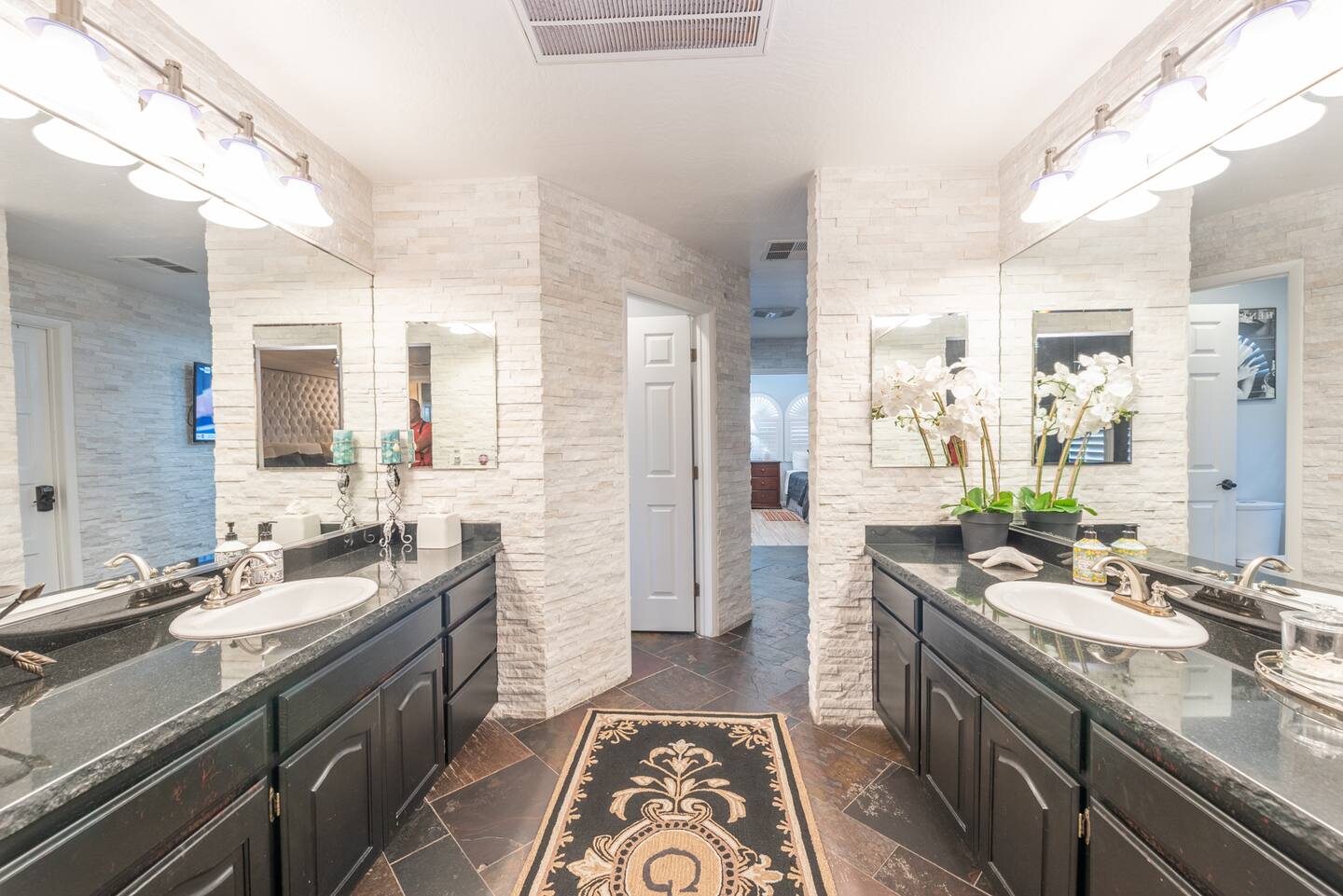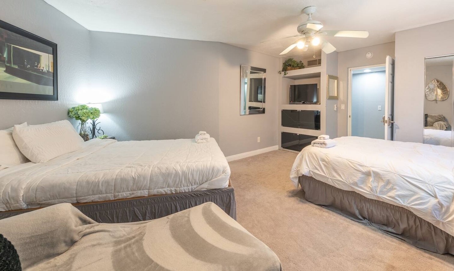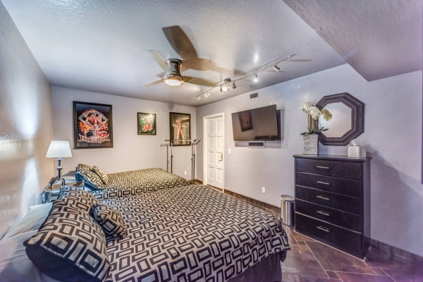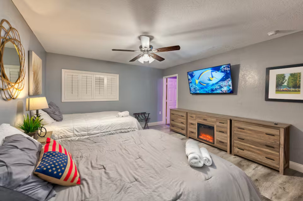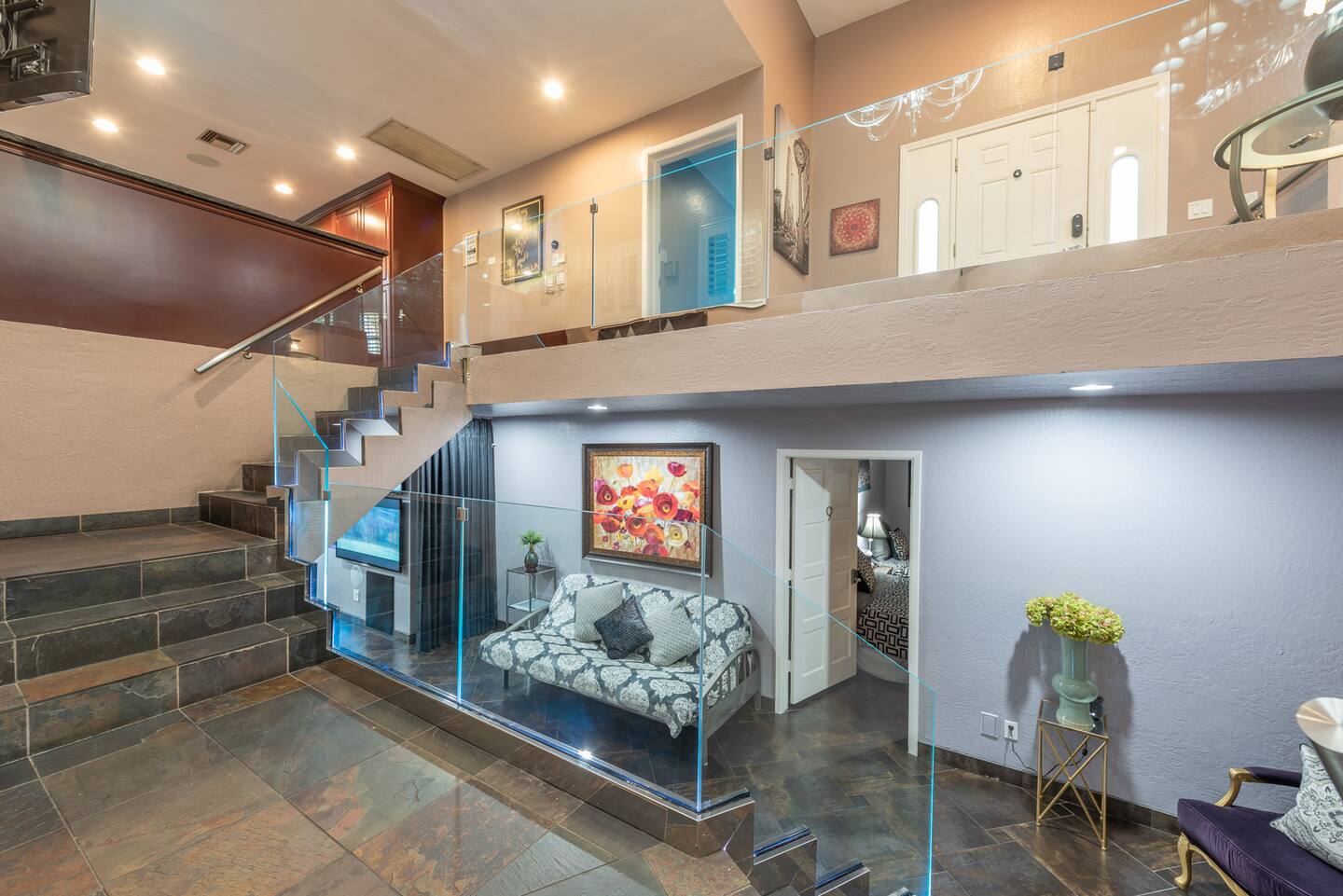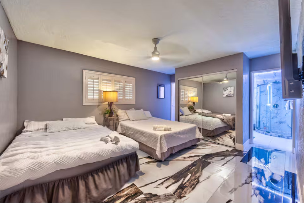 Unwind in the master bedroom, where a large screen awaits, surrounded by ample seating, creating a private sanctuary for relaxation and entertainment.