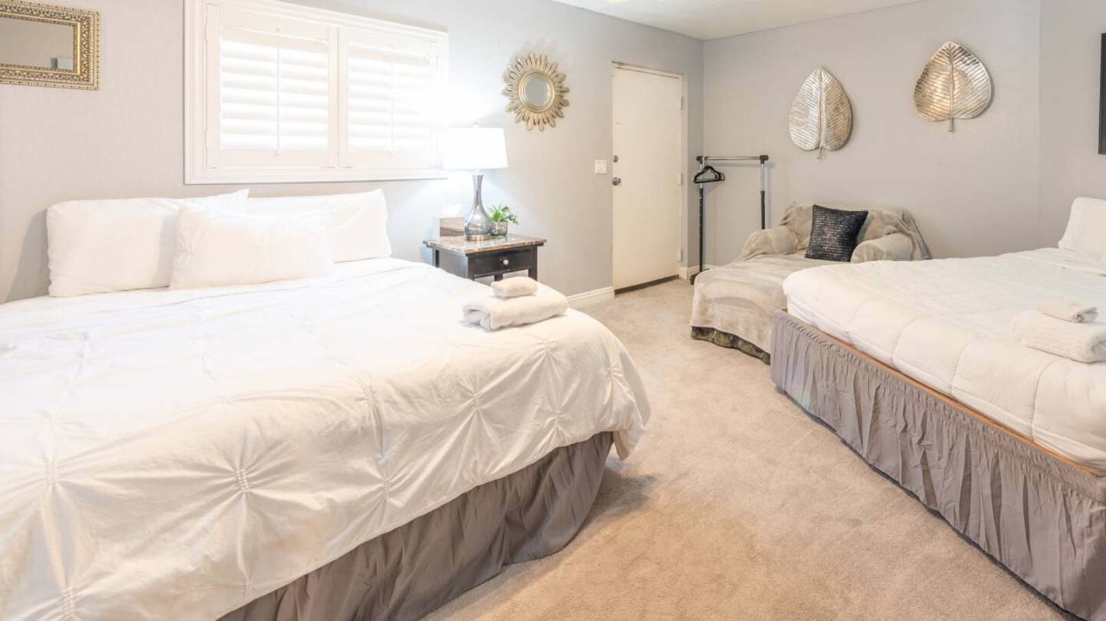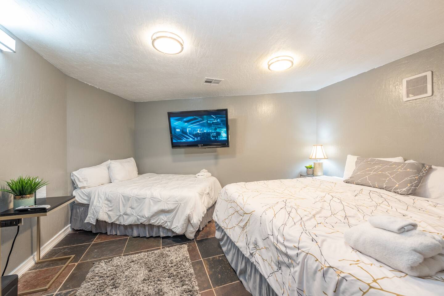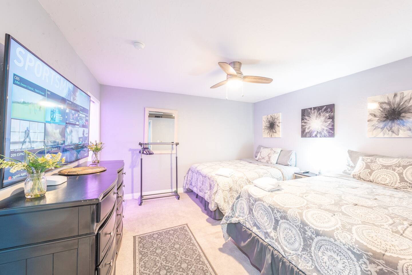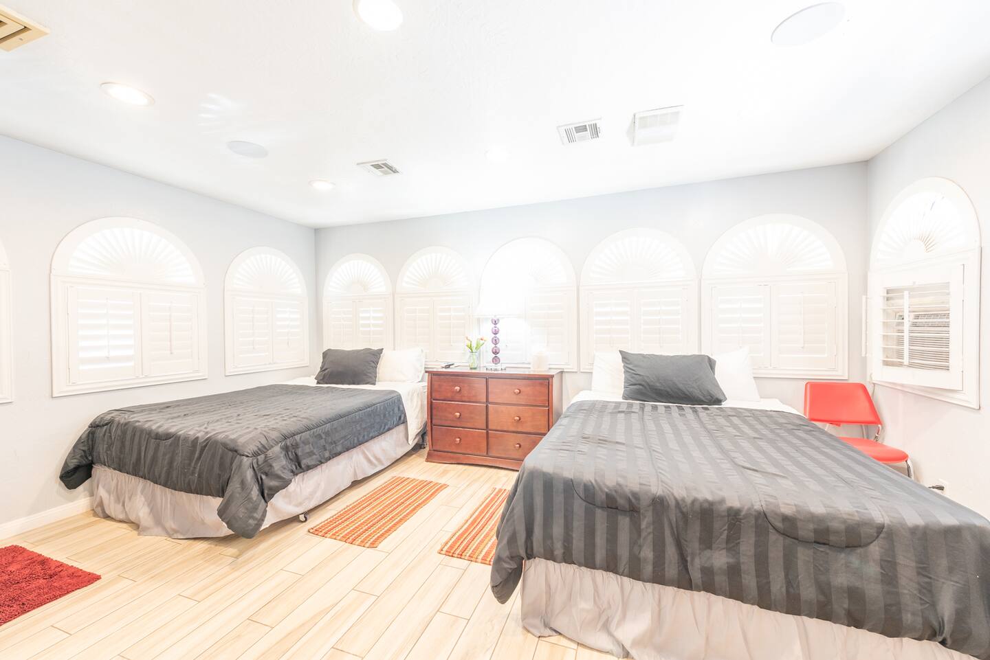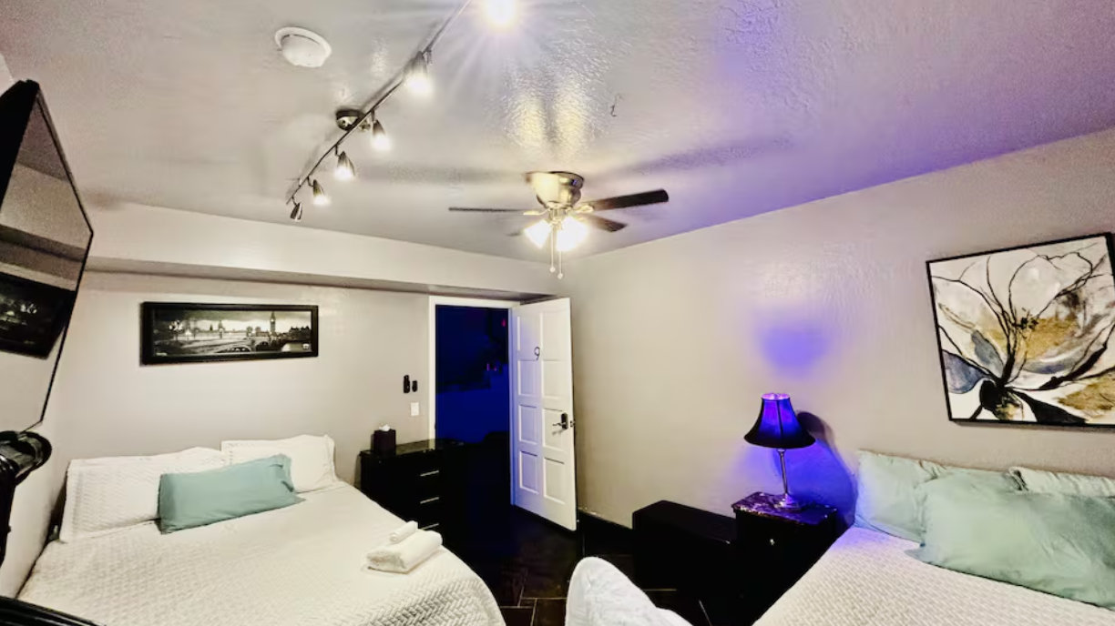 Unwind in the master bedroom, where a large screen awaits, surrounded by ample seating, creating a private sanctuary for relaxation and entertainment.