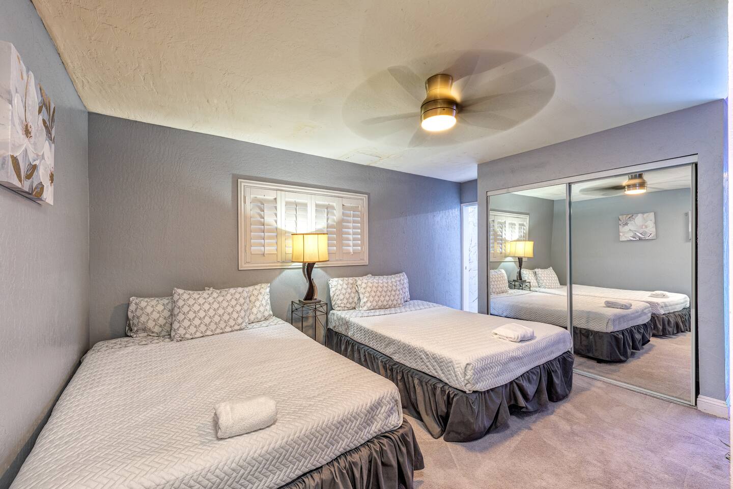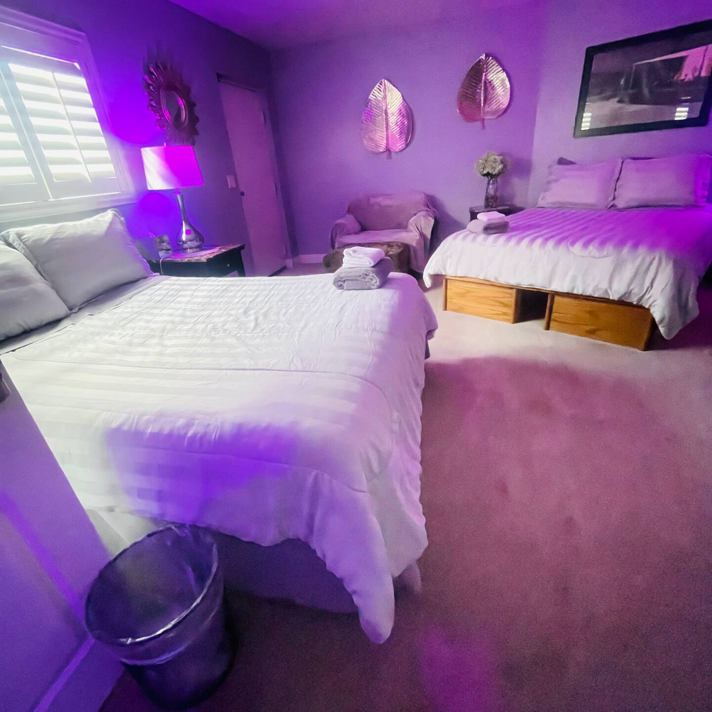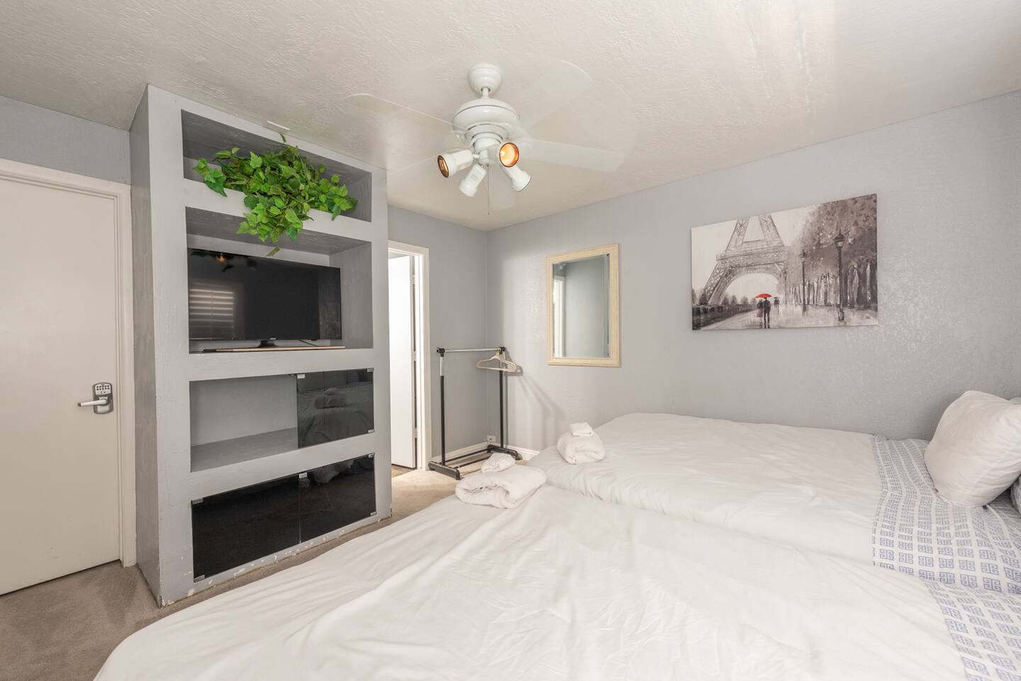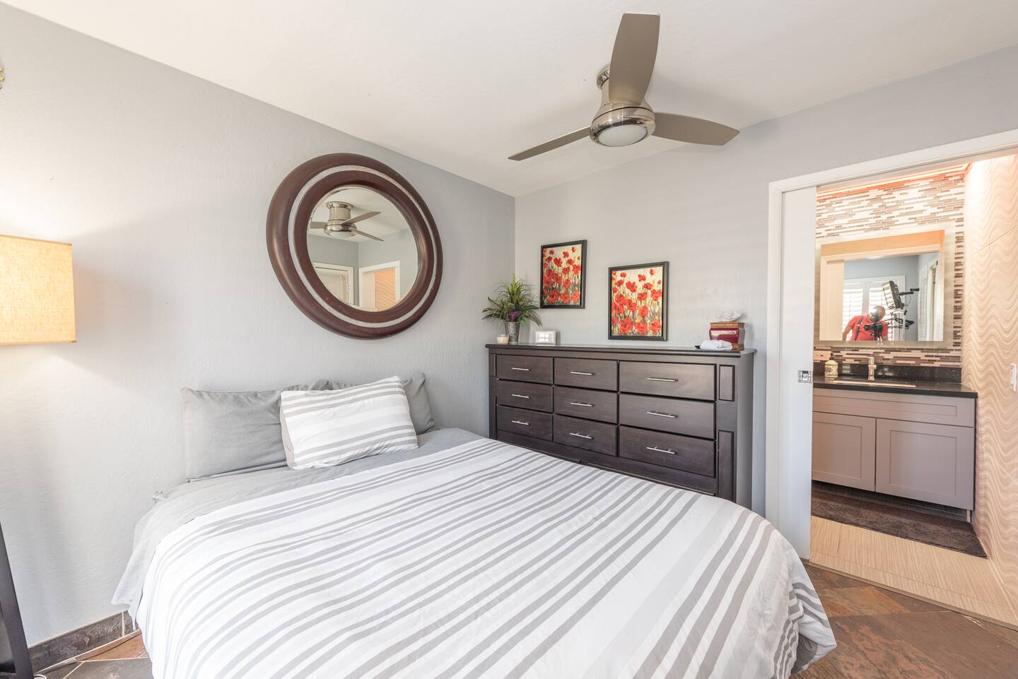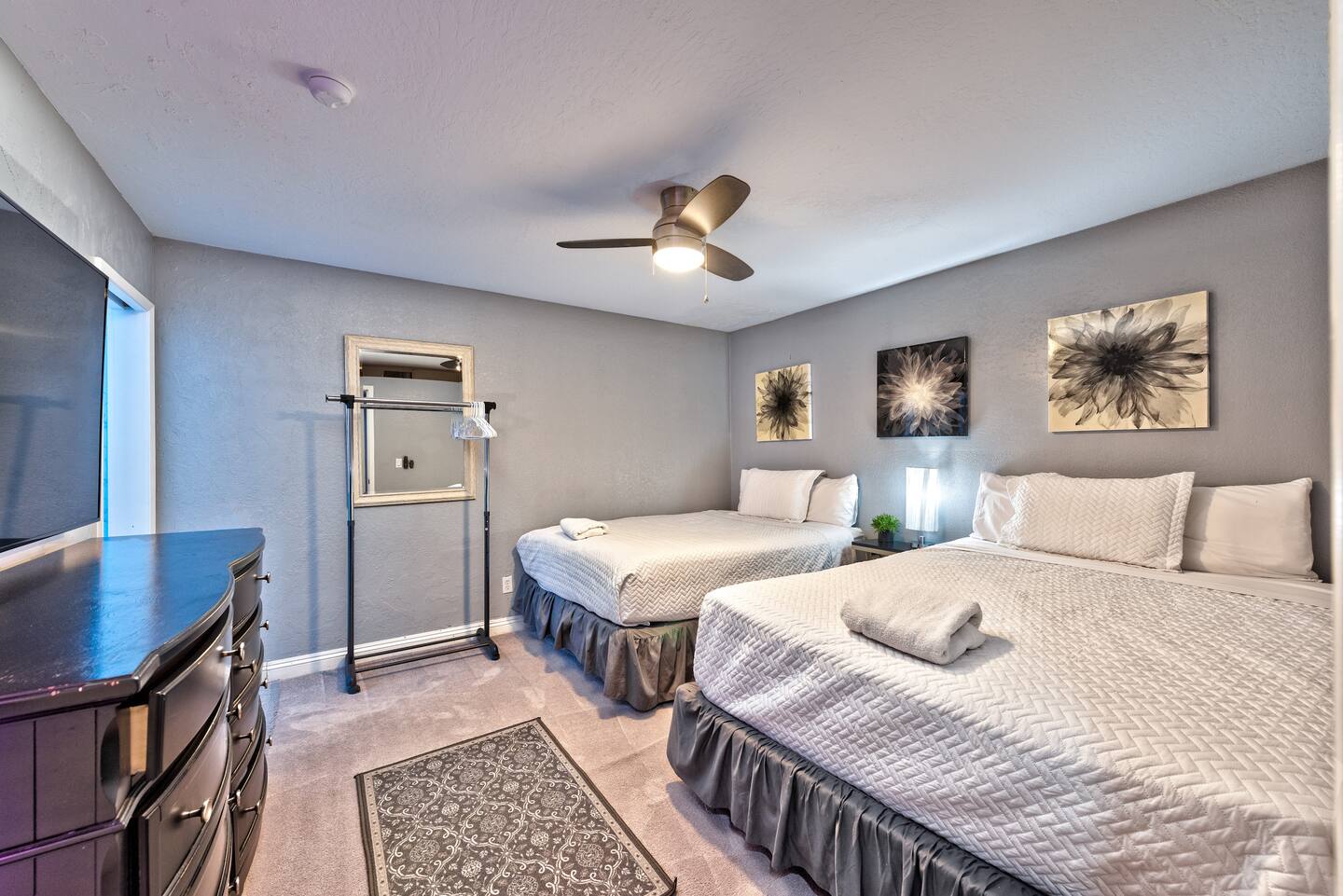 Unwind in the master bedroom, where a large screen awaits, surrounded by ample seating, creating a private sanctuary for relaxation and entertainment.