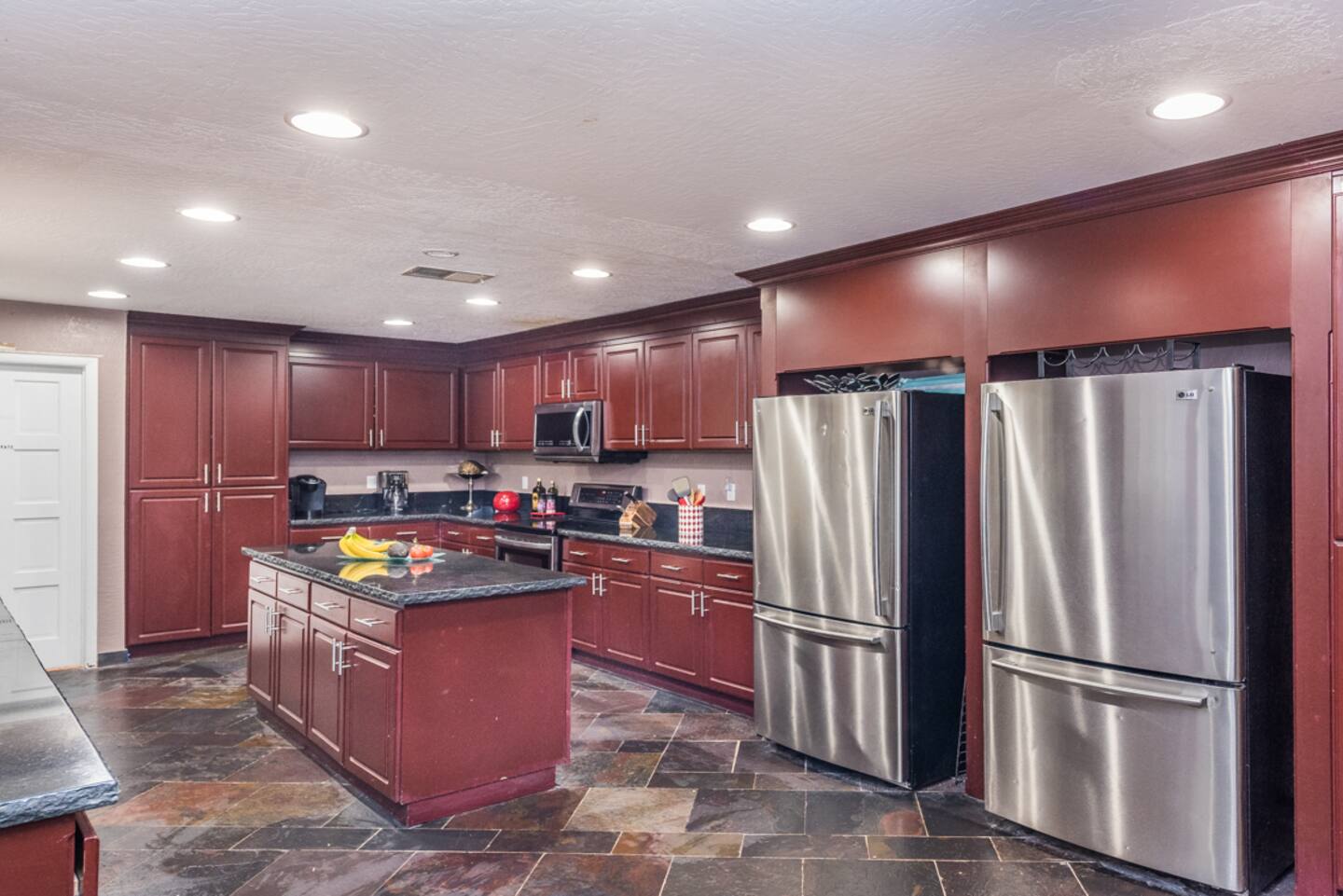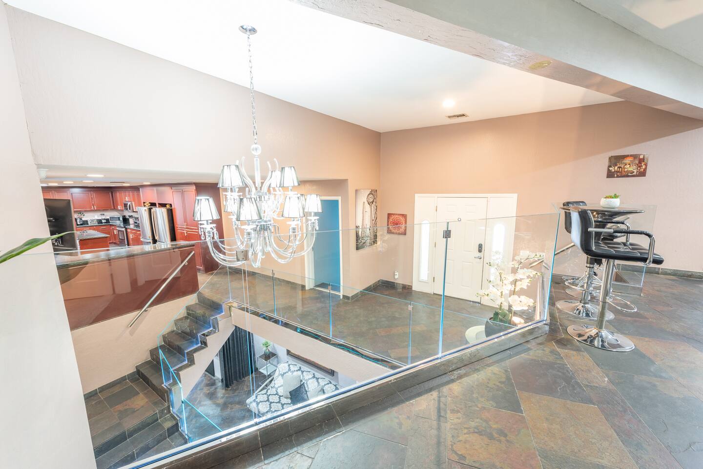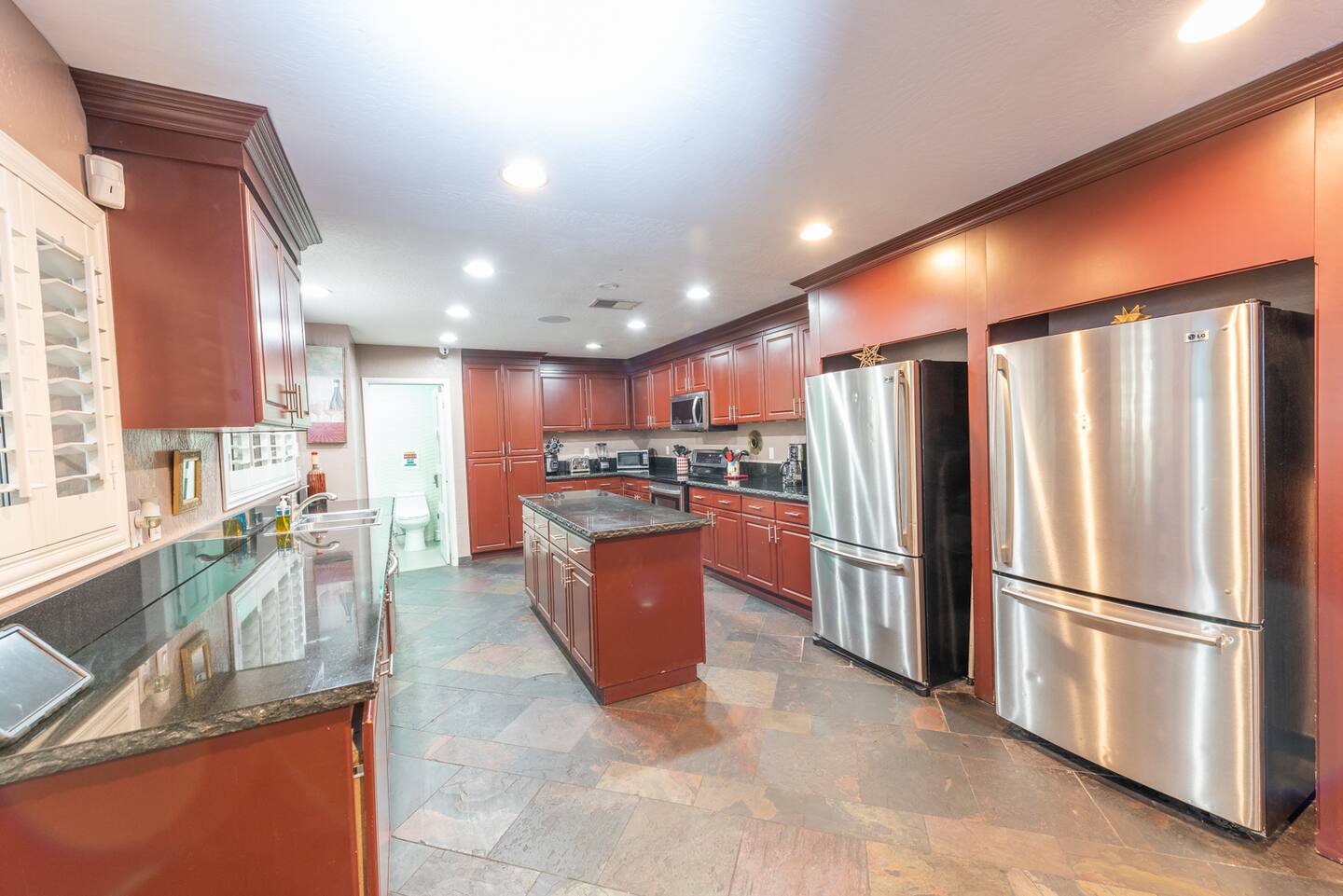 Indulge in culinary delights in the spacious dining room, where seating for over 20 guests ensures that no moment of entertainment is missed. Meanwhile, the kitchen boasts a screen strategically placed above a bar top, inviting conversation and culinary creativity.