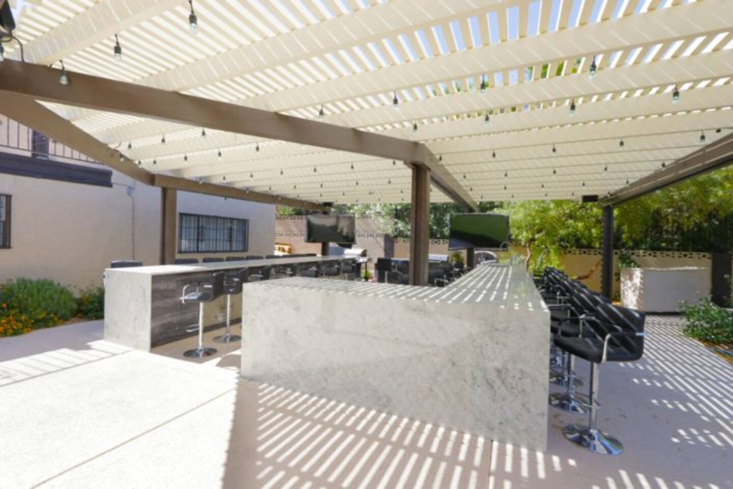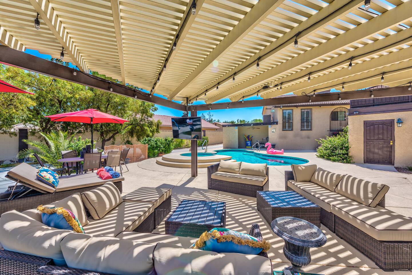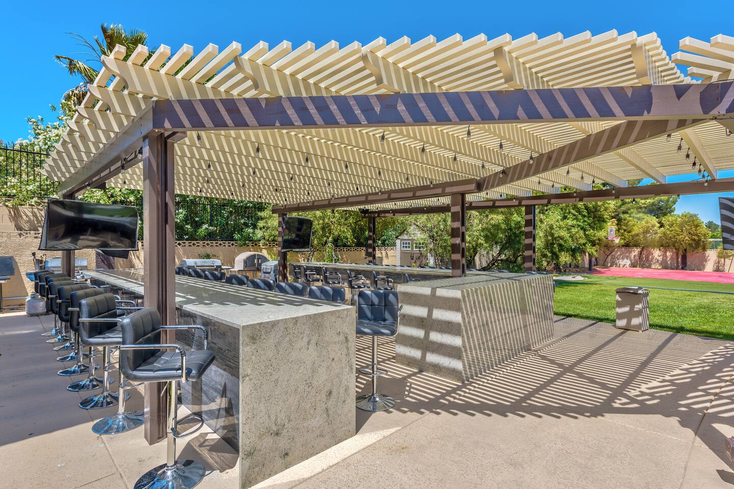 Step outside to discover the backyard oasis, featuring multiple BBQs with a covered patio area for over 40 guests.