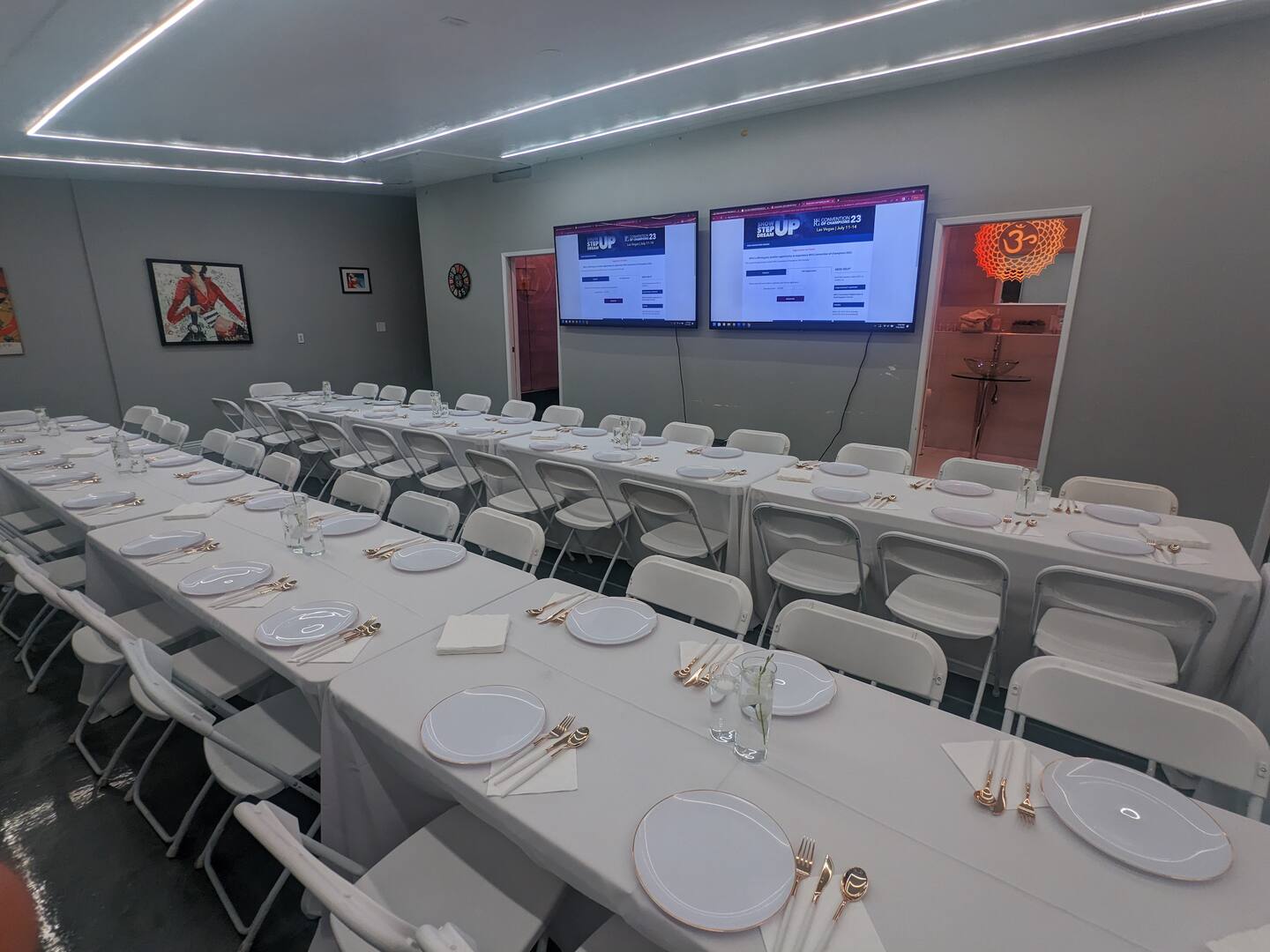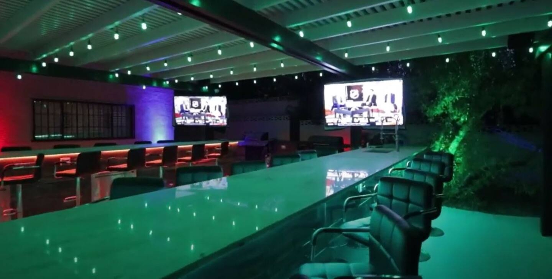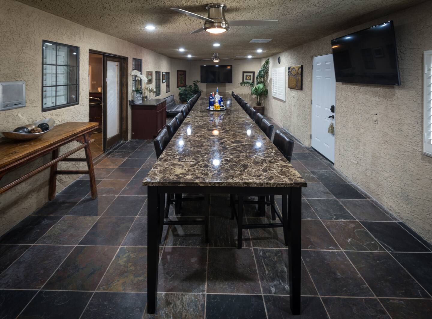 Throughout the villa's 30 TVs, guests have access to all channels, sports packages, and streaming services, ensuring endless entertainment options. In the sprawling meeting room, 7 screens stand ready to elevate your presentations or immerse your guests in an unforgettable viewing experience, with seating and dining for over 50 people.