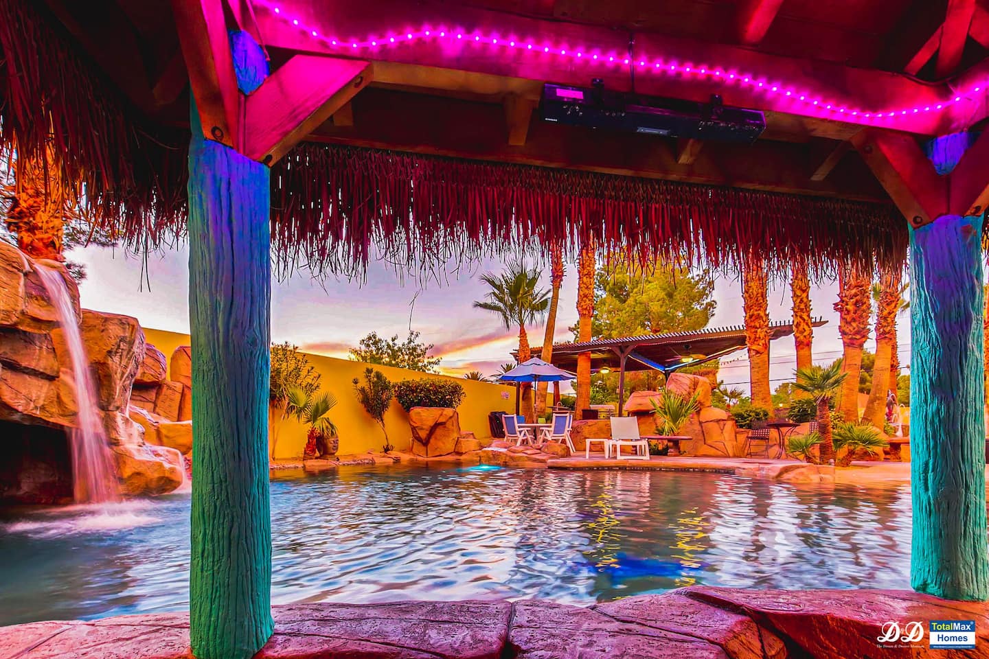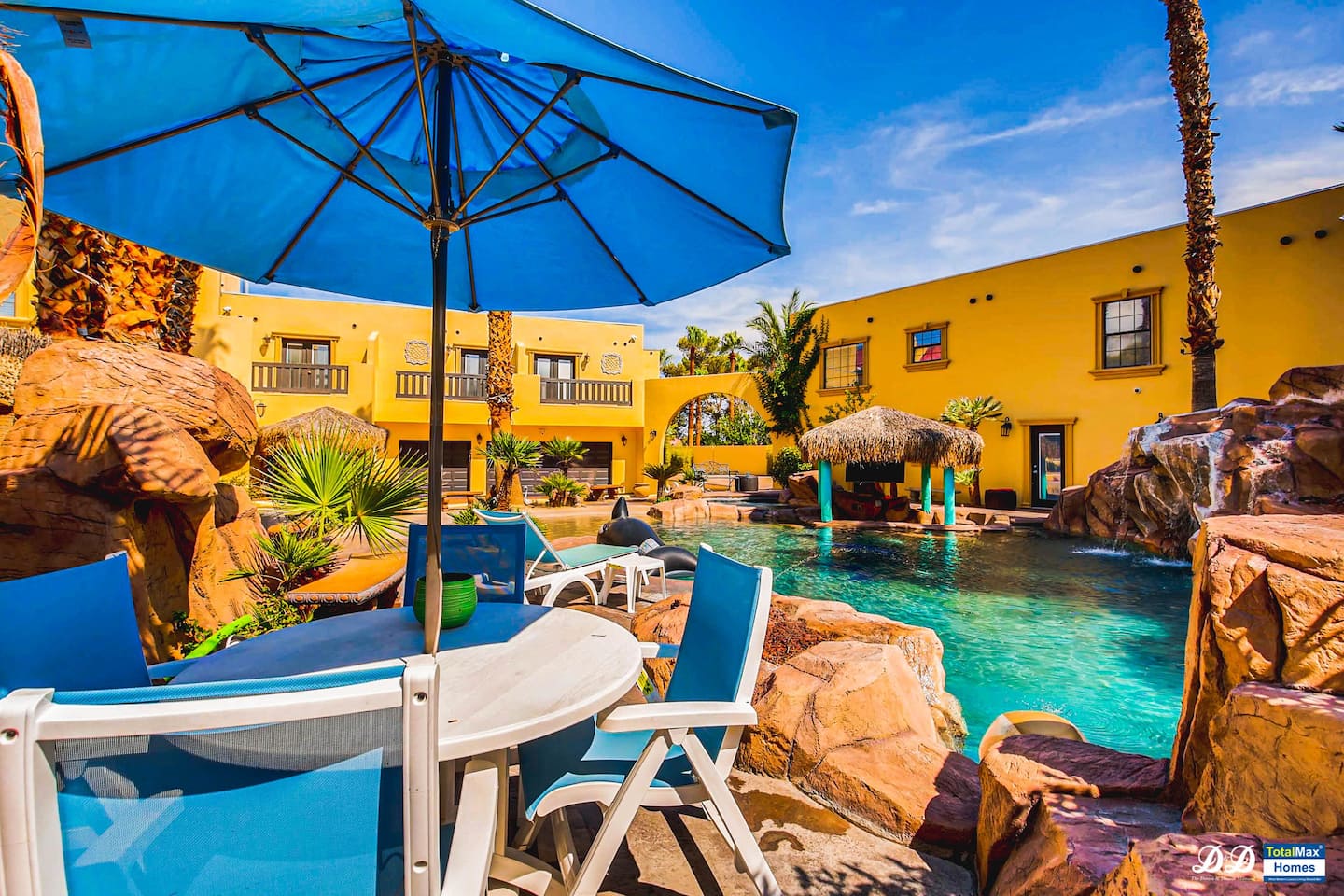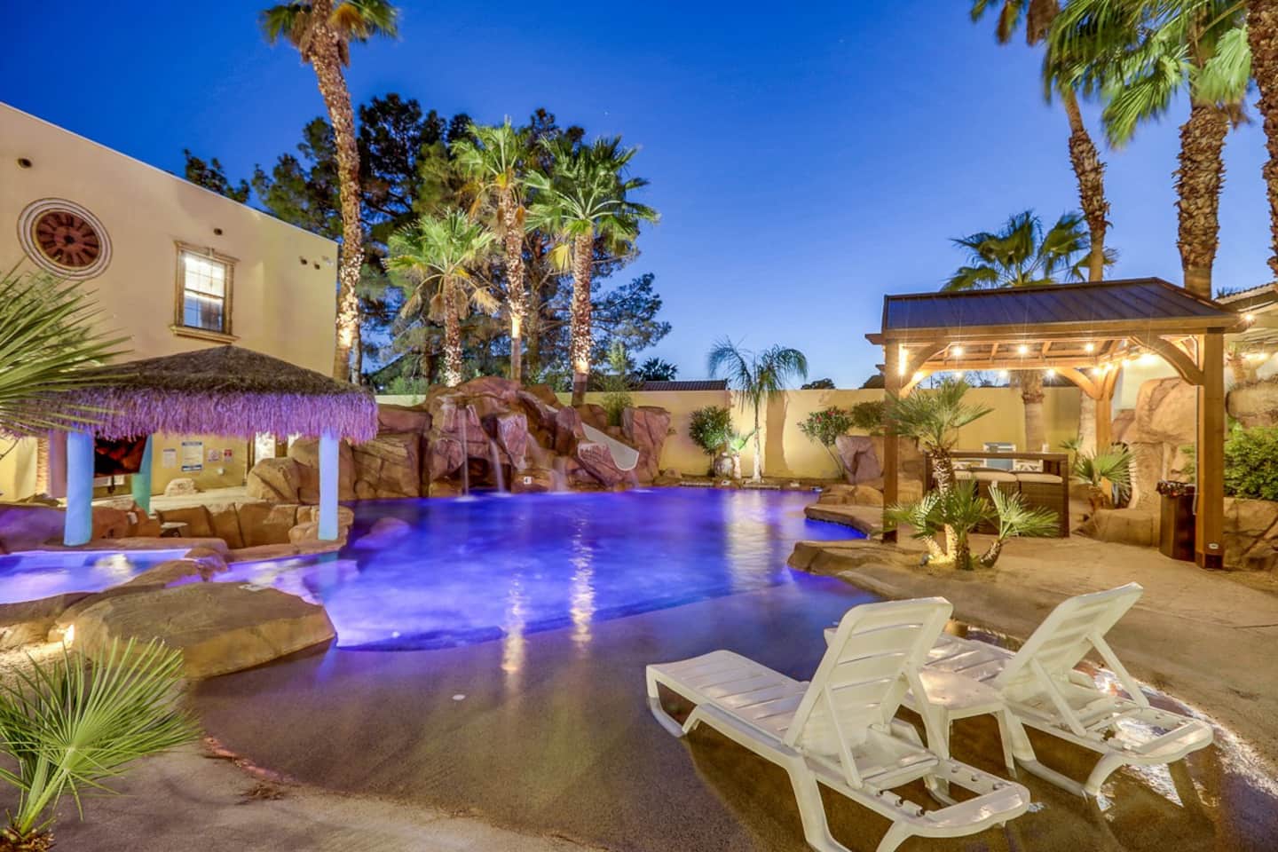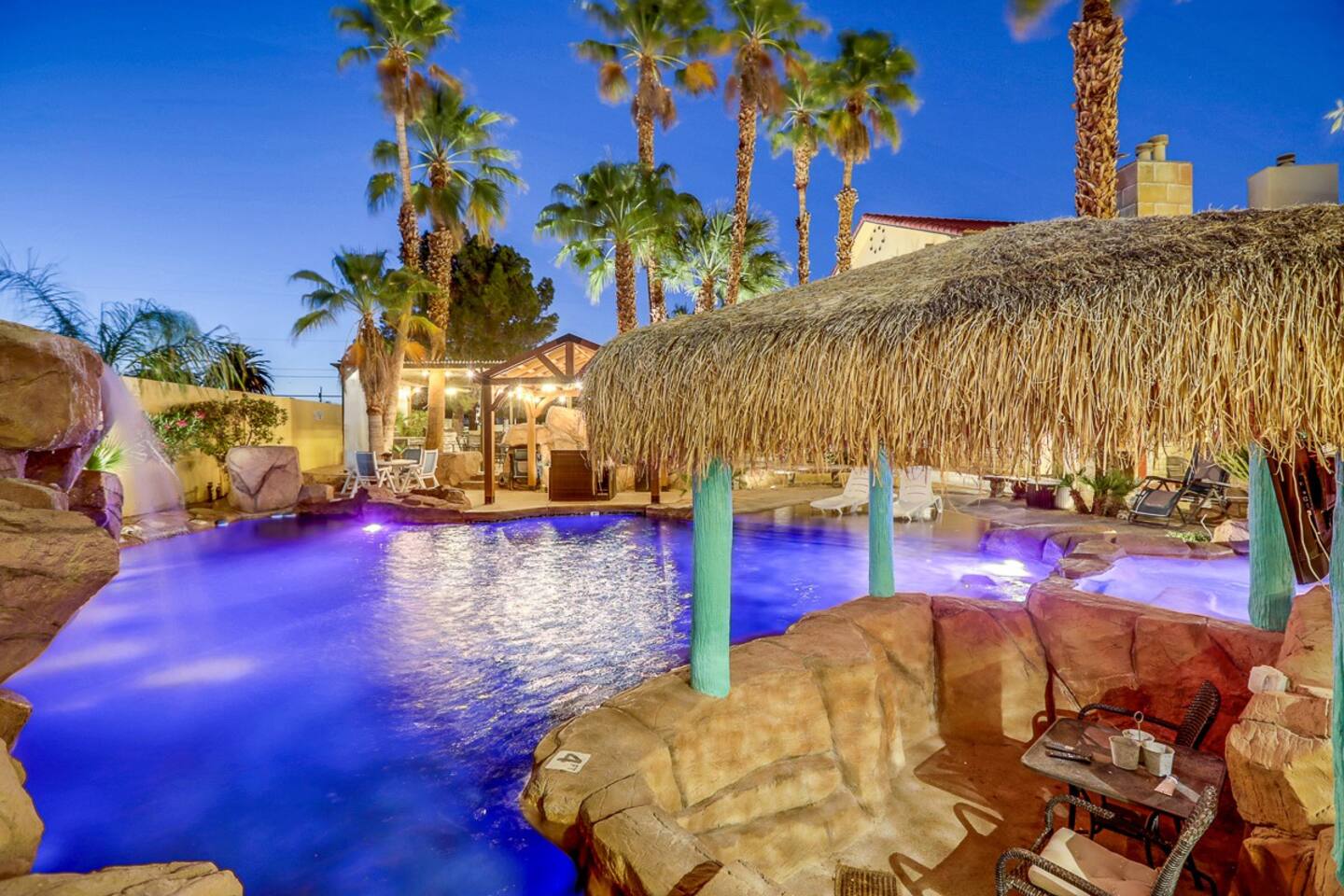 For the happy go lucky Vegas trip, fun is the center of each and every occasion. That is why we have built 8 water works into the property to ensure you the fun even in the hot Vegas sun. The center of the 8-water works is a huge resort pool featuring waterfalls, grotto, swim up bars with bar benches in the water, and Hawaiian style Palapa as your shades when you having a drink in the pool bar. A beach entry with 38 tall palm trees surrounding the pool and throughout the mansion, when you are sitting in the pool, it is a question to ponder if you are in Hawaii or heaven on earth Vegas. Either way, we feel you would be having a time of your life.