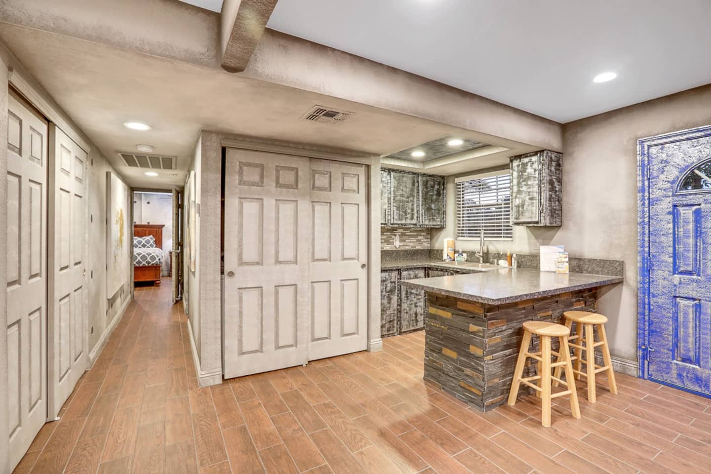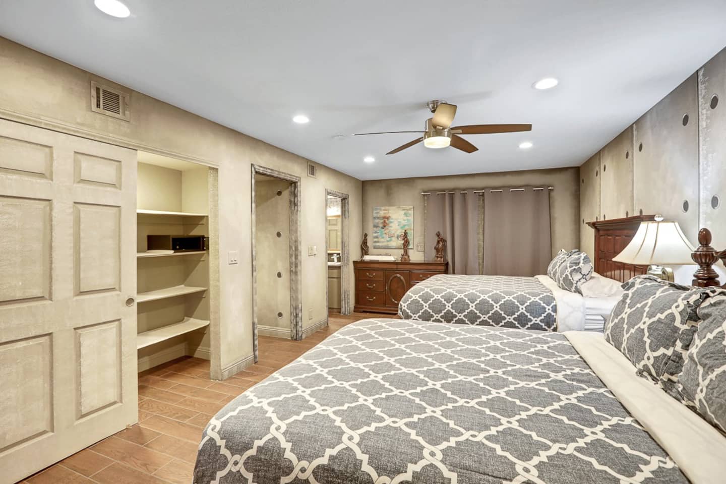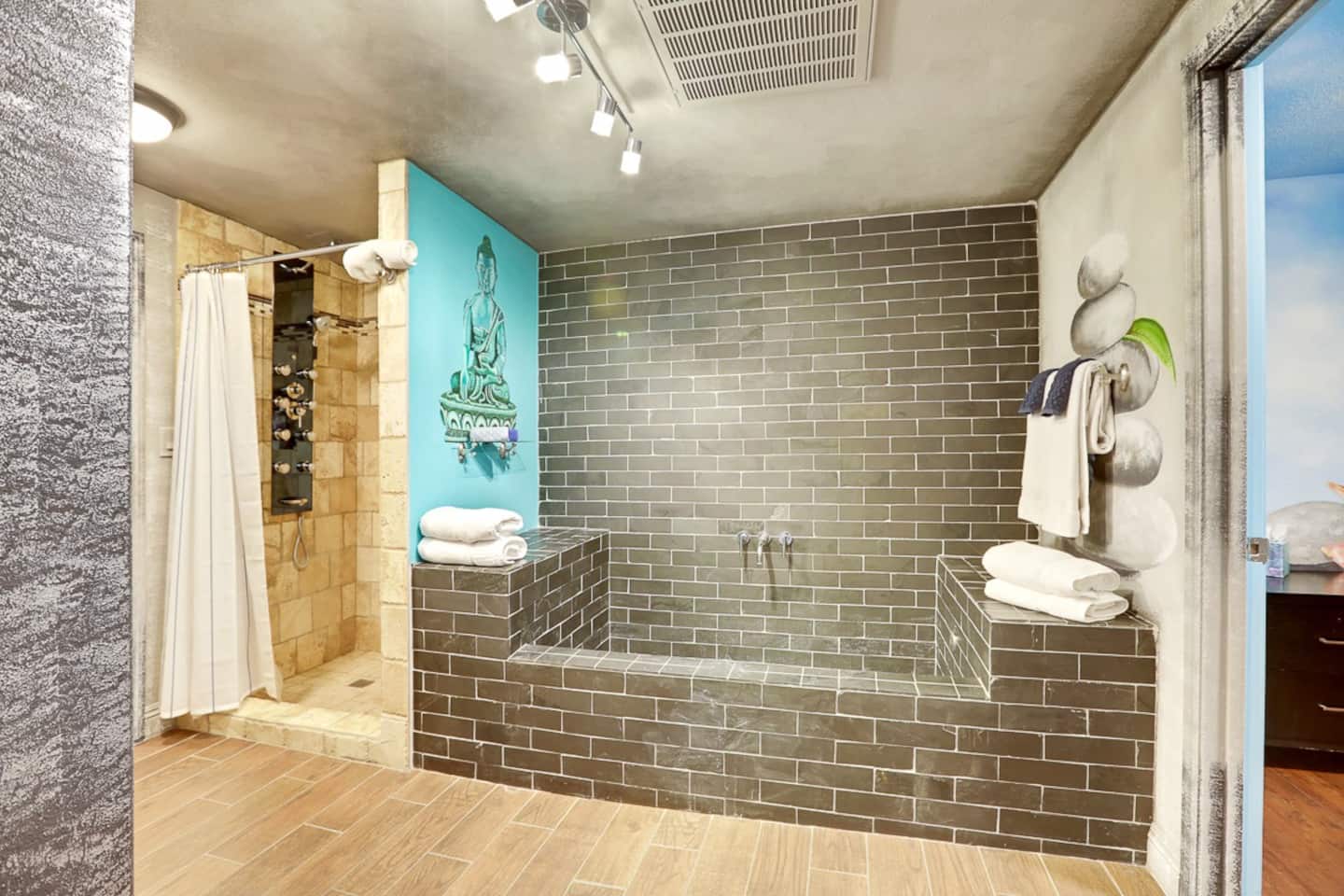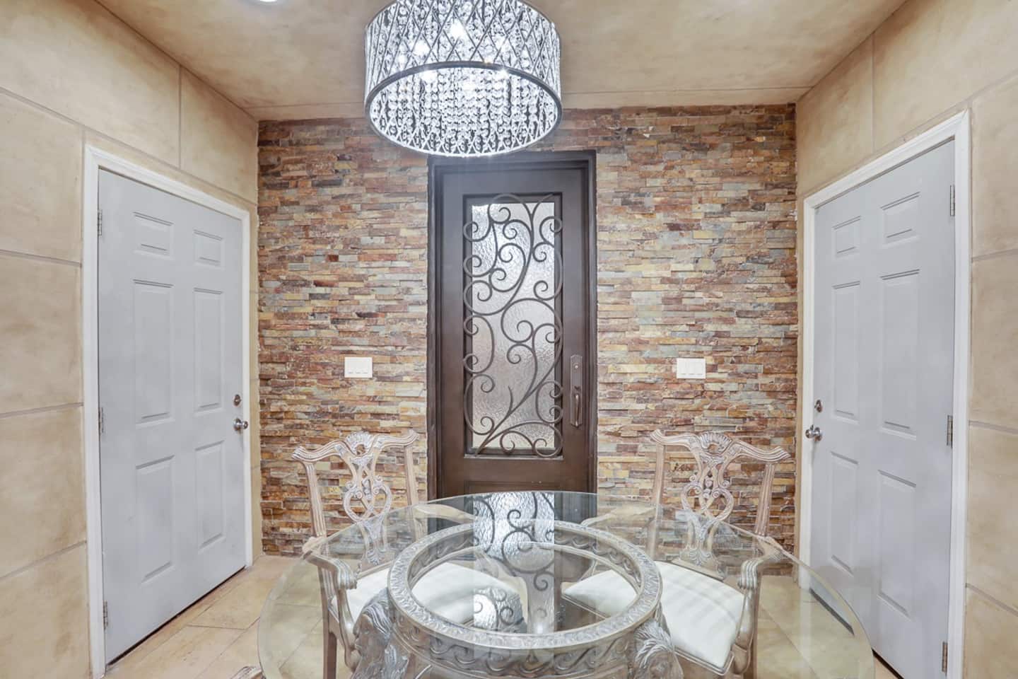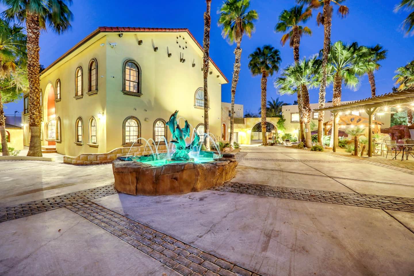 For the happy go lucky Vegas trip, fun is the center of each and every occasion. That is why we have built 8 water works into the property to ensure you the fun even in the hot Vegas sun. The center of the 8-water works is a huge resort pool featuring waterfalls, grotto, swim up bars with bar benches in the water, and Hawaiian style Palapa as your shades when you having a drink in the pool bar. A beach entry with 38 tall palm trees surrounding the pool and throughout the mansion, when you are sitting in the pool, it is a question to ponder if you are in Hawaii or heaven on earth Vegas. Either way, we feel you would be having a time of your life.