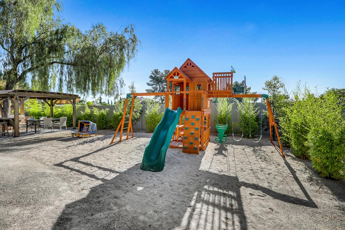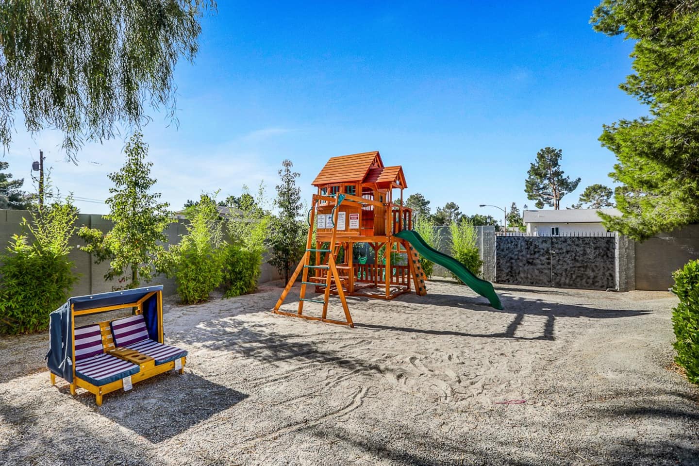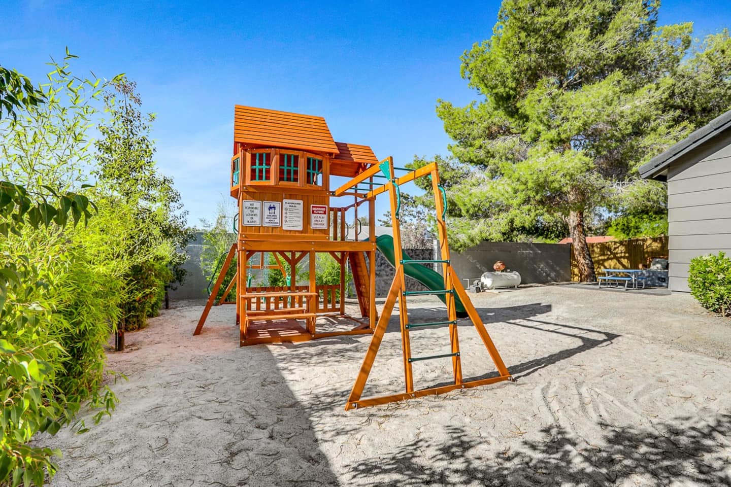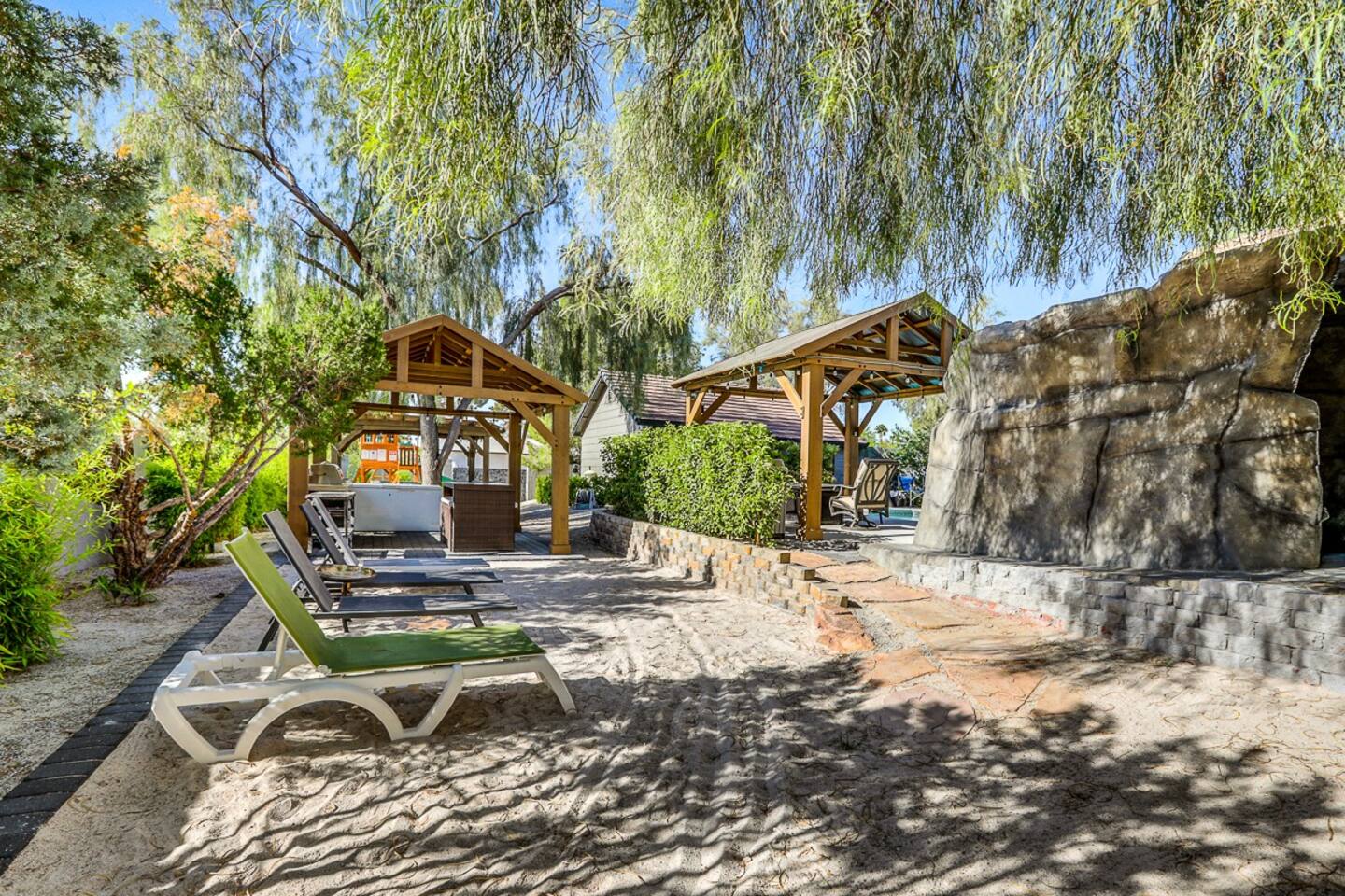 A heated spa, waterfall, slide, cave and spa inside with mist to cool you down during the day.
